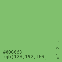 Цвет #80C06D в цветовой модели RGB обозначается тремя октетами (128, 192, 109) в десятичном формате и #80C06D в шестнадцатиричном (hex) формате, которые являются интенсивностью красного 128 (hex 80), интенсивность зелёного 192 (hex C0) и интенсивность синего 109 (hex 6D).