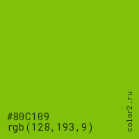 Цвет #80C109 в цветовой модели RGB обозначается тремя октетами (128, 193, 9) в десятичном формате и #80C109 в шестнадцатиричном (hex) формате, которые являются интенсивностью красного 128 (hex 80), интенсивность зелёного 193 (hex C1) и интенсивность синего 9 (hex 09).