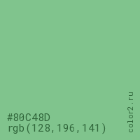 Цвет #80C48D в цветовой модели RGB обозначается тремя октетами (128, 196, 141) в десятичном формате и #80C48D в шестнадцатиричном (hex) формате, которые являются интенсивностью красного 128 (hex 80), интенсивность зелёного 196 (hex C4) и интенсивность синего 141 (hex 8D).