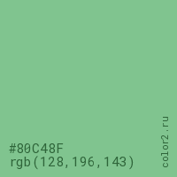 Цвет #80C48F в цветовой модели RGB обозначается тремя октетами (128, 196, 143) в десятичном формате и #80C48F в шестнадцатиричном (hex) формате, которые являются интенсивностью красного 128 (hex 80), интенсивность зелёного 196 (hex C4) и интенсивность синего 143 (hex 8F).