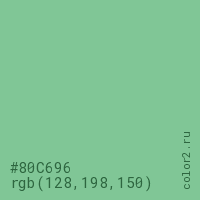 Цвет #80C696 в цветовой модели RGB обозначается тремя октетами (128, 198, 150) в десятичном формате и #80C696 в шестнадцатиричном (hex) формате, которые являются интенсивностью красного 128 (hex 80), интенсивность зелёного 198 (hex C6) и интенсивность синего 150 (hex 96).
