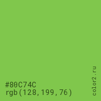 Цвет #80C74C в цветовой модели RGB обозначается тремя октетами (128, 199, 76) в десятичном формате и #80C74C в шестнадцатиричном (hex) формате, которые являются интенсивностью красного 128 (hex 80), интенсивность зелёного 199 (hex C7) и интенсивность синего 76 (hex 4C).