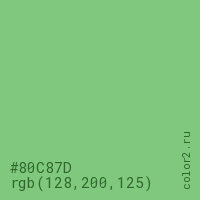 Цвет #80C87D в цветовой модели RGB обозначается тремя октетами (128, 200, 125) в десятичном формате и #80C87D в шестнадцатиричном (hex) формате, которые являются интенсивностью красного 128 (hex 80), интенсивность зелёного 200 (hex C8) и интенсивность синего 125 (hex 7D).