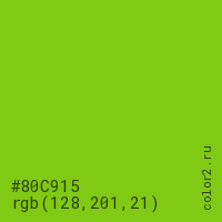 Цвет #80C915 в цветовой модели RGB обозначается тремя октетами (128, 201, 21) в десятичном формате и #80C915 в шестнадцатиричном (hex) формате, которые являются интенсивностью красного 128 (hex 80), интенсивность зелёного 201 (hex C9) и интенсивность синего 21 (hex 15).