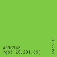 Цвет #80C945 в цветовой модели RGB обозначается тремя октетами (128, 201, 69) в десятичном формате и #80C945 в шестнадцатиричном (hex) формате, которые являются интенсивностью красного 128 (hex 80), интенсивность зелёного 201 (hex C9) и интенсивность синего 69 (hex 45).