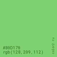 Цвет #80D170 в цветовой модели RGB обозначается тремя октетами (128, 209, 112) в десятичном формате и #80D170 в шестнадцатиричном (hex) формате, которые являются интенсивностью красного 128 (hex 80), интенсивность зелёного 209 (hex D1) и интенсивность синего 112 (hex 70).