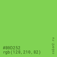 Цвет #80D252 в цветовой модели RGB обозначается тремя октетами (128, 210, 82) в десятичном формате и #80D252 в шестнадцатиричном (hex) формате, которые являются интенсивностью красного 128 (hex 80), интенсивность зелёного 210 (hex D2) и интенсивность синего 82 (hex 52).
