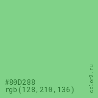 Цвет #80D288 в цветовой модели RGB обозначается тремя октетами (128, 210, 136) в десятичном формате и #80D288 в шестнадцатиричном (hex) формате, которые являются интенсивностью красного 128 (hex 80), интенсивность зелёного 210 (hex D2) и интенсивность синего 136 (hex 88).
