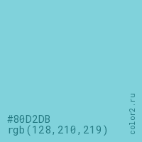 Цвет #80D2DB в цветовой модели RGB обозначается тремя октетами (128, 210, 219) в десятичном формате и #80D2DB в шестнадцатиричном (hex) формате, которые являются интенсивностью красного 128 (hex 80), интенсивность зелёного 210 (hex D2) и интенсивность синего 219 (hex DB).