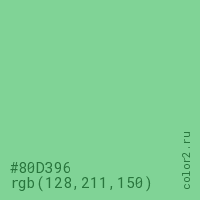 Цвет #80D396 в цветовой модели RGB обозначается тремя октетами (128, 211, 150) в десятичном формате и #80D396 в шестнадцатиричном (hex) формате, которые являются интенсивностью красного 128 (hex 80), интенсивность зелёного 211 (hex D3) и интенсивность синего 150 (hex 96).