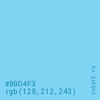 Цвет #80D4F3 в цветовой модели RGB обозначается тремя октетами (128, 212, 243) в десятичном формате и #80D4F3 в шестнадцатиричном (hex) формате, которые являются интенсивностью красного 128 (hex 80), интенсивность зелёного 212 (hex D4) и интенсивность синего 243 (hex F3).