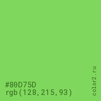Цвет #80D75D в цветовой модели RGB обозначается тремя октетами (128, 215, 93) в десятичном формате и #80D75D в шестнадцатиричном (hex) формате, которые являются интенсивностью красного 128 (hex 80), интенсивность зелёного 215 (hex D7) и интенсивность синего 93 (hex 5D).