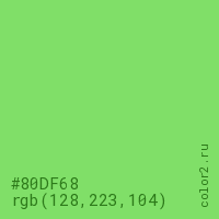 Цвет #80DF68 в цветовой модели RGB обозначается тремя октетами (128, 223, 104) в десятичном формате и #80DF68 в шестнадцатиричном (hex) формате, которые являются интенсивностью красного 128 (hex 80), интенсивность зелёного 223 (hex DF) и интенсивность синего 104 (hex 68).