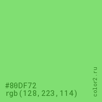 Цвет #80DF72 в цветовой модели RGB обозначается тремя октетами (128, 223, 114) в десятичном формате и #80DF72 в шестнадцатиричном (hex) формате, которые являются интенсивностью красного 128 (hex 80), интенсивность зелёного 223 (hex DF) и интенсивность синего 114 (hex 72).