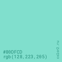 Цвет RGB(128, 223, 205) в процентом отношении количества цвета состоит из 50.2% красного (red), 87.5% зелёного (green) и 80.4% синего (blue).