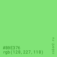 Цвет #80E376 в цветовой модели RGB обозначается тремя октетами (128, 227, 118) в десятичном формате и #80E376 в шестнадцатиричном (hex) формате, которые являются интенсивностью красного 128 (hex 80), интенсивность зелёного 227 (hex E3) и интенсивность синего 118 (hex 76).