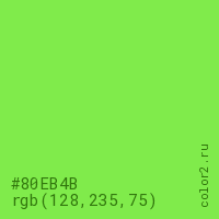 Цвет #80EB4B в цветовой модели RGB обозначается тремя октетами (128, 235, 75) в десятичном формате и #80EB4B в шестнадцатиричном (hex) формате, которые являются интенсивностью красного 128 (hex 80), интенсивность зелёного 235 (hex EB) и интенсивность синего 75 (hex 4B).