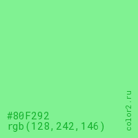 Цвет #80F292 в цветовой модели RGB обозначается тремя октетами (128, 242, 146) в десятичном формате и #80F292 в шестнадцатиричном (hex) формате, которые являются интенсивностью красного 128 (hex 80), интенсивность зелёного 242 (hex F2) и интенсивность синего 146 (hex 92).