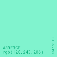 Цвет #80F3CE в цветовой модели RGB обозначается тремя октетами (128, 243, 206) в десятичном формате и #80F3CE в шестнадцатиричном (hex) формате, которые являются интенсивностью красного 128 (hex 80), интенсивность зелёного 243 (hex F3) и интенсивность синего 206 (hex CE).