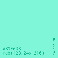 Цвет #80F6D8 в цветовой модели RGB обозначается тремя октетами (128, 246, 216) в десятичном формате и #80F6D8 в шестнадцатиричном (hex) формате, которые являются интенсивностью красного 128 (hex 80), интенсивность зелёного 246 (hex F6) и интенсивность синего 216 (hex D8).