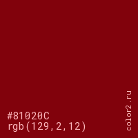Цвет #81020C в цветовой модели RGB обозначается тремя октетами (129, 2, 12) в десятичном формате и #81020C в шестнадцатиричном (hex) формате, которые являются интенсивностью красного 129 (hex 81), интенсивность зелёного 2 (hex 02) и интенсивность синего 12 (hex 0C).