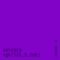 Цвет #8103C8 в цветовой модели RGB обозначается тремя октетами (129, 3, 200) в десятичном формате и #8103C8 в шестнадцатиричном (hex) формате, которые являются интенсивностью красного 129 (hex 81), интенсивность зелёного 3 (hex 03) и интенсивность синего 200 (hex C8).