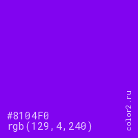 Цвет #8104F0 в цветовой модели RGB обозначается тремя октетами (129, 4, 240) в десятичном формате и #8104F0 в шестнадцатиричном (hex) формате, которые являются интенсивностью красного 129 (hex 81), интенсивность зелёного 4 (hex 04) и интенсивность синего 240 (hex F0).