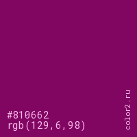 Цвет #810662 в цветовой модели RGB обозначается тремя октетами (129, 6, 98) в десятичном формате и #810662 в шестнадцатиричном (hex) формате, которые являются интенсивностью красного 129 (hex 81), интенсивность зелёного 6 (hex 06) и интенсивность синего 98 (hex 62).
