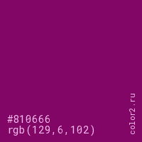 Цвет #810666 в цветовой модели RGB обозначается тремя октетами (129, 6, 102) в десятичном формате и #810666 в шестнадцатиричном (hex) формате, которые являются интенсивностью красного 129 (hex 81), интенсивность зелёного 6 (hex 06) и интенсивность синего 102 (hex 66).