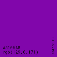 Цвет #8106AB в цветовой модели RGB обозначается тремя октетами (129, 6, 171) в десятичном формате и #8106AB в шестнадцатиричном (hex) формате, которые являются интенсивностью красного 129 (hex 81), интенсивность зелёного 6 (hex 06) и интенсивность синего 171 (hex AB).