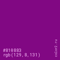 Цвет #810883 в цветовой модели RGB обозначается тремя октетами (129, 8, 131) в десятичном формате и #810883 в шестнадцатиричном (hex) формате, которые являются интенсивностью красного 129 (hex 81), интенсивность зелёного 8 (hex 08) и интенсивность синего 131 (hex 83).