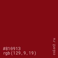 Цвет #810913 в цветовой модели RGB обозначается тремя октетами (129, 9, 19) в десятичном формате и #810913 в шестнадцатиричном (hex) формате, которые являются интенсивностью красного 129 (hex 81), интенсивность зелёного 9 (hex 09) и интенсивность синего 19 (hex 13).