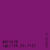 Цвет #811670 в цветовой модели RGB обозначается тремя октетами (129, 22, 112) в десятичном формате и #811670 в шестнадцатиричном (hex) формате, которые являются интенсивностью красного 129 (hex 81), интенсивность зелёного 22 (hex 16) и интенсивность синего 112 (hex 70).
