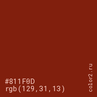 Цвет #811F0D в цветовой модели RGB обозначается тремя октетами (129, 31, 13) в десятичном формате и #811F0D в шестнадцатиричном (hex) формате, которые являются интенсивностью красного 129 (hex 81), интенсивность зелёного 31 (hex 1F) и интенсивность синего 13 (hex 0D).