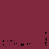 Цвет #81283F в цветовой модели RGB обозначается тремя октетами (129, 40, 63) в десятичном формате и #81283F в шестнадцатиричном (hex) формате, которые являются интенсивностью красного 129 (hex 81), интенсивность зелёного 40 (hex 28) и интенсивность синего 63 (hex 3F).