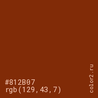 Цвет #812B07 в цветовой модели RGB обозначается тремя октетами (129, 43, 7) в десятичном формате и #812B07 в шестнадцатиричном (hex) формате, которые являются интенсивностью красного 129 (hex 81), интенсивность зелёного 43 (hex 2B) и интенсивность синего 7 (hex 07).
