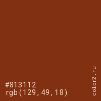 Цвет #813112 в цветовой модели RGB обозначается тремя октетами (129, 49, 18) в десятичном формате и #813112 в шестнадцатиричном (hex) формате, которые являются интенсивностью красного 129 (hex 81), интенсивность зелёного 49 (hex 31) и интенсивность синего 18 (hex 12).