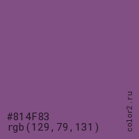 Цвет #814F83 в цветовой модели RGB обозначается тремя октетами (129, 79, 131) в десятичном формате и #814F83 в шестнадцатиричном (hex) формате, которые являются интенсивностью красного 129 (hex 81), интенсивность зелёного 79 (hex 4F) и интенсивность синего 131 (hex 83).