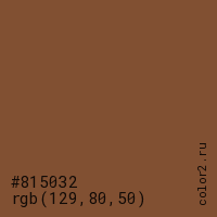 Цвет #815032 в цветовой модели RGB обозначается тремя октетами (129, 80, 50) в десятичном формате и #815032 в шестнадцатиричном (hex) формате, которые являются интенсивностью красного 129 (hex 81), интенсивность зелёного 80 (hex 50) и интенсивность синего 50 (hex 32).