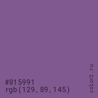 Цвет #815991 в цветовой модели RGB обозначается тремя октетами (129, 89, 145) в десятичном формате и #815991 в шестнадцатиричном (hex) формате, которые являются интенсивностью красного 129 (hex 81), интенсивность зелёного 89 (hex 59) и интенсивность синего 145 (hex 91).