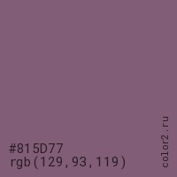 Цвет #815D77 в цветовой модели RGB обозначается тремя октетами (129, 93, 119) в десятичном формате и #815D77 в шестнадцатиричном (hex) формате, которые являются интенсивностью красного 129 (hex 81), интенсивность зелёного 93 (hex 5D) и интенсивность синего 119 (hex 77).