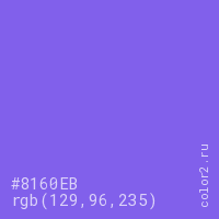 Цвет #8160EB в цветовой модели RGB обозначается тремя октетами (129, 96, 235) в десятичном формате и #8160EB в шестнадцатиричном (hex) формате, которые являются интенсивностью красного 129 (hex 81), интенсивность зелёного 96 (hex 60) и интенсивность синего 235 (hex EB).