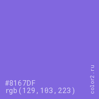 Цвет #8167DF в цветовой модели RGB обозначается тремя октетами (129, 103, 223) в десятичном формате и #8167DF в шестнадцатиричном (hex) формате, которые являются интенсивностью красного 129 (hex 81), интенсивность зелёного 103 (hex 67) и интенсивность синего 223 (hex DF).