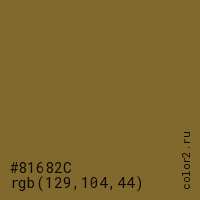 Цвет #81682C в цветовой модели RGB обозначается тремя октетами (129, 104, 44) в десятичном формате и #81682C в шестнадцатиричном (hex) формате, которые являются интенсивностью красного 129 (hex 81), интенсивность зелёного 104 (hex 68) и интенсивность синего 44 (hex 2C).