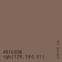 Цвет #81685B в цветовой модели RGB обозначается тремя октетами (129, 104, 91) в десятичном формате и #81685B в шестнадцатиричном (hex) формате, которые являются интенсивностью красного 129 (hex 81), интенсивность зелёного 104 (hex 68) и интенсивность синего 91 (hex 5B).
