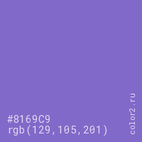 Цвет #8169C9 в цветовой модели RGB обозначается тремя октетами (129, 105, 201) в десятичном формате и #8169C9 в шестнадцатиричном (hex) формате, которые являются интенсивностью красного 129 (hex 81), интенсивность зелёного 105 (hex 69) и интенсивность синего 201 (hex C9).