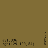 Цвет #816D36 в цветовой модели RGB обозначается тремя октетами (129, 109, 54) в десятичном формате и #816D36 в шестнадцатиричном (hex) формате, которые являются интенсивностью красного 129 (hex 81), интенсивность зелёного 109 (hex 6D) и интенсивность синего 54 (hex 36).