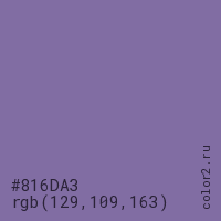Цвет RGB(129, 109, 163) в процентом отношении количества цвета состоит из 50.6% красного (red), 42.7% зелёного (green) и 63.9% синего (blue).