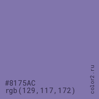 Цвет #8175AC в цветовой модели RGB обозначается тремя октетами (129, 117, 172) в десятичном формате и #8175AC в шестнадцатиричном (hex) формате, которые являются интенсивностью красного 129 (hex 81), интенсивность зелёного 117 (hex 75) и интенсивность синего 172 (hex AC).