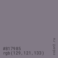 Цвет #817985 в цветовой модели RGB обозначается тремя октетами (129, 121, 133) в десятичном формате и #817985 в шестнадцатиричном (hex) формате, которые являются интенсивностью красного 129 (hex 81), интенсивность зелёного 121 (hex 79) и интенсивность синего 133 (hex 85).
